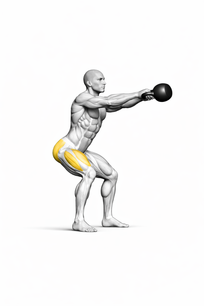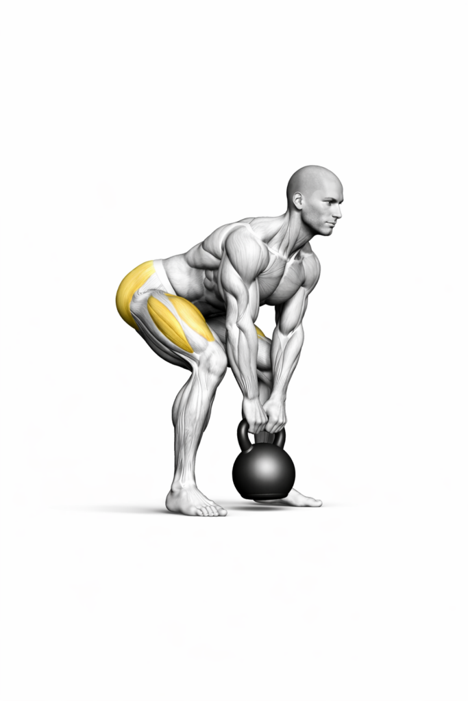 Kettlebell Deadlifts trainieren die hintere Muskelkette und fördern eine saubere Hüftstreckung.